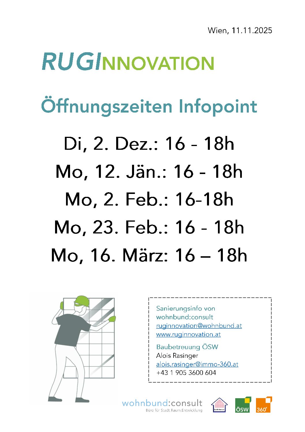 Im Gemeinschaftsraum der Stiege 3 (EG) wird mit Beginn der Sanierung ein Infopoint eingerichtet. Zu den Öffnungszeiten können Sie sich über Aktuelles auf der Baustelle informieren und Ihre Anliegen einbringen. Die weiteren Termine werden laufend über Aushänge kommuniziert.